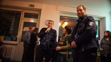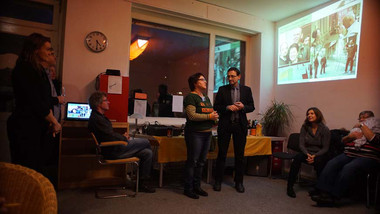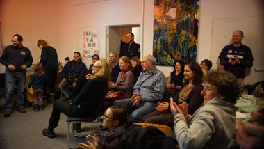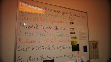 Unübersehbar, die Aufschrift Kiezmediator auf dem T-Shirt von Sabine Danzer. Die aufgeweckte Mediatorin führt durch das abwechslungsreiche Abendprogramm. Zu Beginn gibt es eine kleine Einführung in die Arbeit der Konfliktagentur, gefolgt von kurzen Interviews mit dem Bezirksstadtrat für Soziales und Bürgerdienste, Stephan von Dassel, Michael Langer vom Quartiersmanagement Sparrplatz, dem Präventionsbeauftragten des Polizeiabschnittes 35, Wulf Dornblut, sowie Hans-Georg Rennert und Claudia Schwarz vom Sprengelhaus. Es folgt eine Pause, um sich am Buffet zu stärken, das von verschiedenen Einrichtungen, Cafés und Restaurants aus dem Kiez gesponsert wurde. Den Abschluss macht eine Zeitreise durch den Kiez von den 1960er Jahren bis heute in Form einer Diashow.