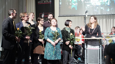 Als Stephan von Dassel dann das Thema Konflikte aufkommen lässt, horchen alle auf. Er beschreibt mit einigen plastischen Beispielen, etwa dem Kampf ums kalte Buffet, wie häufig man auf Konflikte stößt und wie wichtig es ist, diese zivilisiert beizulegen. Während die Menge die Worte überdenkt, sitzen sieben Personen an einem Tisch hinten links und rutschen voller Vorfreude auf ihren Stühlen hin und her. Denn seit mittlerweile 12 Jahren wird der Preis vergeben und genauso lange ist die Truppe um Silka Riedel, Vorsitzende der Konfliktangentur, im Einsatz. Dieses Jahr war es endlich soweit und die Konfliktagentur wird, als erster Verein aus dem Sprengelkiez, auf die Bühne gerufen. Voller Stolz empfangen die Mediatoren die Rosen und ihre Urkunde. In der Dankesrede sagte die Vorsitzende: „Ich freue mich sehr über diese Ehrung. Sie ist eine Anerkennung für unseren langjährigen freiwilligen und unentgeltlichen Einsatz, eine respektvolle und konstruktive Kommunikationskultur zu etablieren. Ich bedanke mich bei meinen Kolleginnen und Kollegen und allen, die zu diesem Erfolg beigetragen haben.“